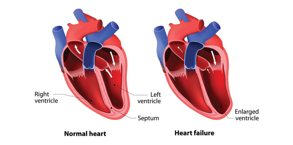 Image: Medical illustration showing a healthy heart vs. a heart with heart failure, highlighting the reduced pumping capacity